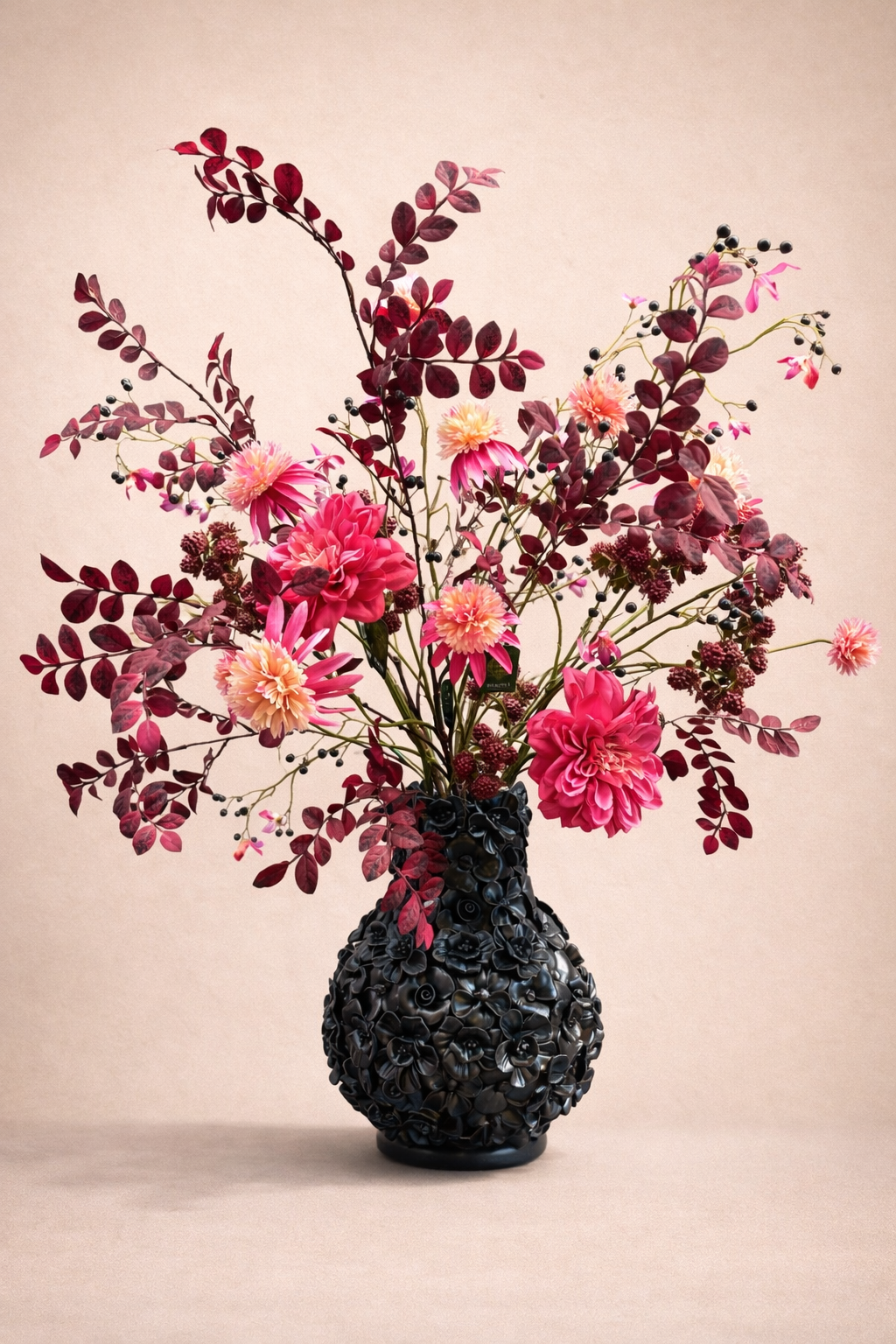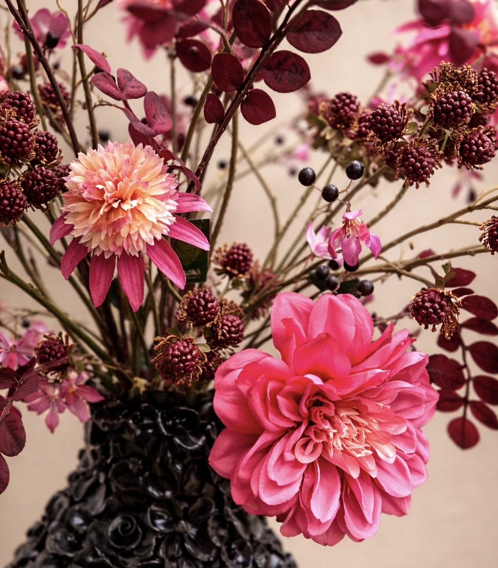 Een weelderig Burgundy zijden boeket met verfijnde bessenaccenten. De diepe rode tinten en natuurlijke texturen stralen warmte en luxe uit, een tijdloze blikvanger die elegantie en sfeer toevoegt aan elk interieur.