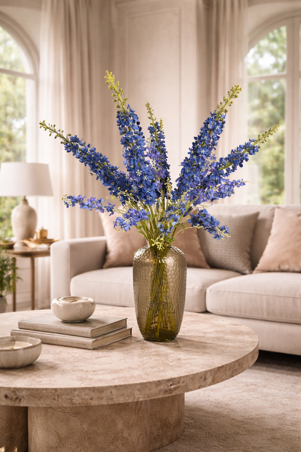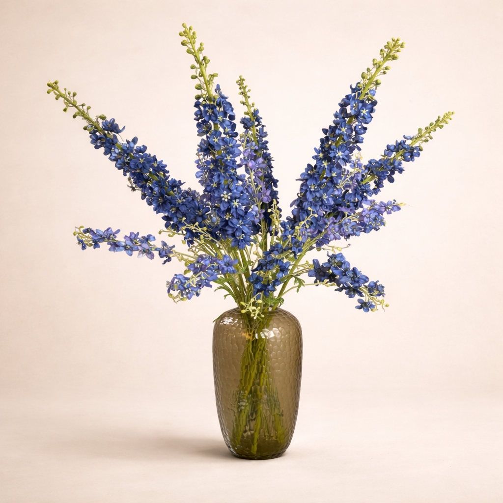 Dit handgemaakte zijden boeket van Silk-ka Delphiniums brengt direct leven, hoogte en elegantie in elke ruimte. De natuurlijke vorm en rijke kleur geven een krachtig maar rustig accent, perfect voor een modern interieur met aardse of blauwe tonen.