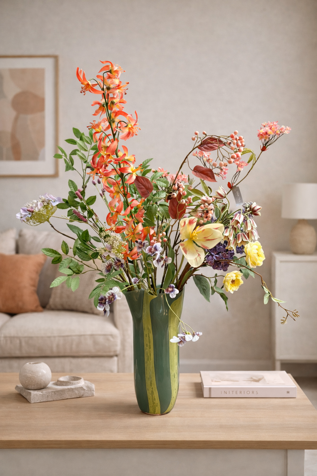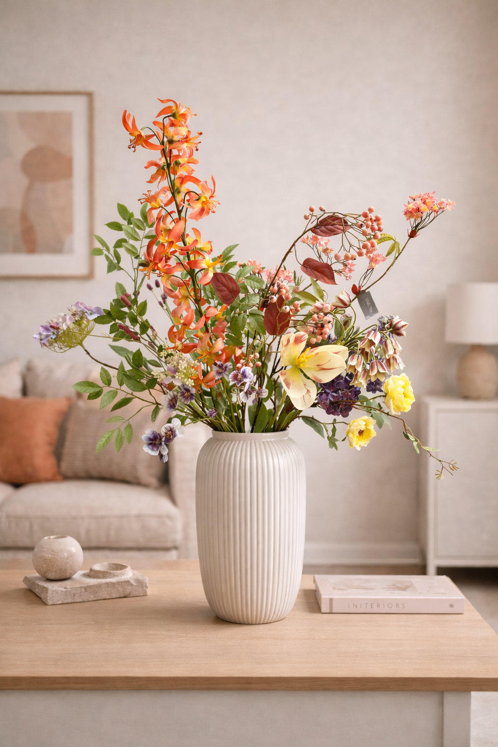 Zijden boeket in warme, natuurlijke tinten met speelse hoogteverschillen. Een verfijnde mix van bloemen. Tijdloos, onderhoudsvrij en perfect als statement in ieder interieur.