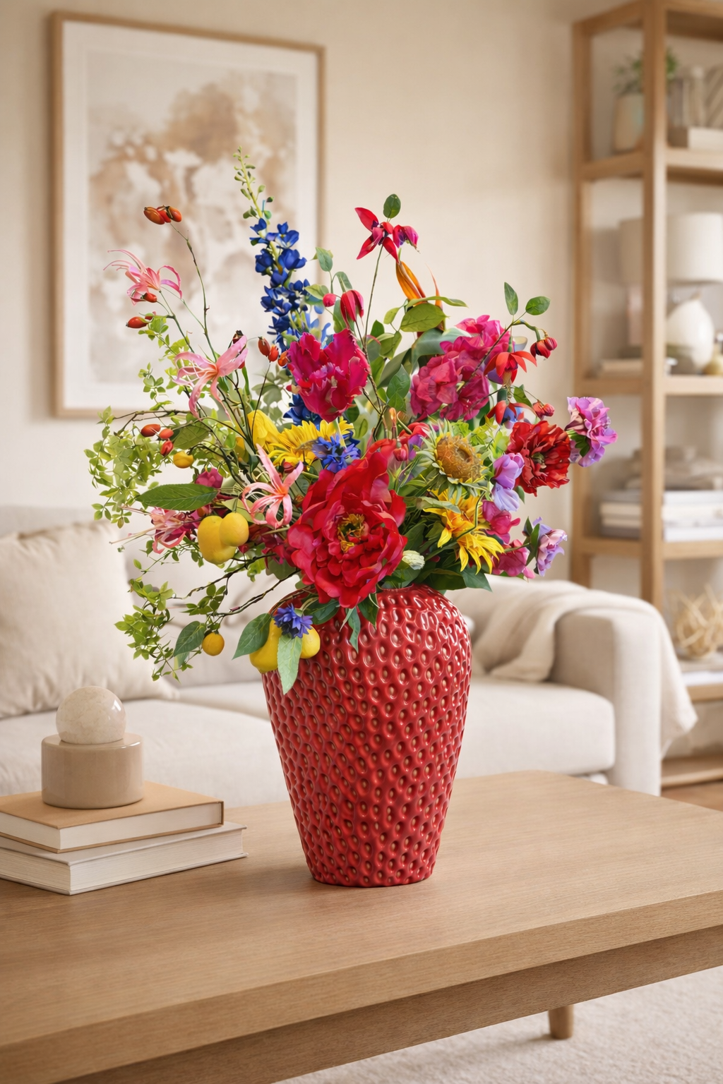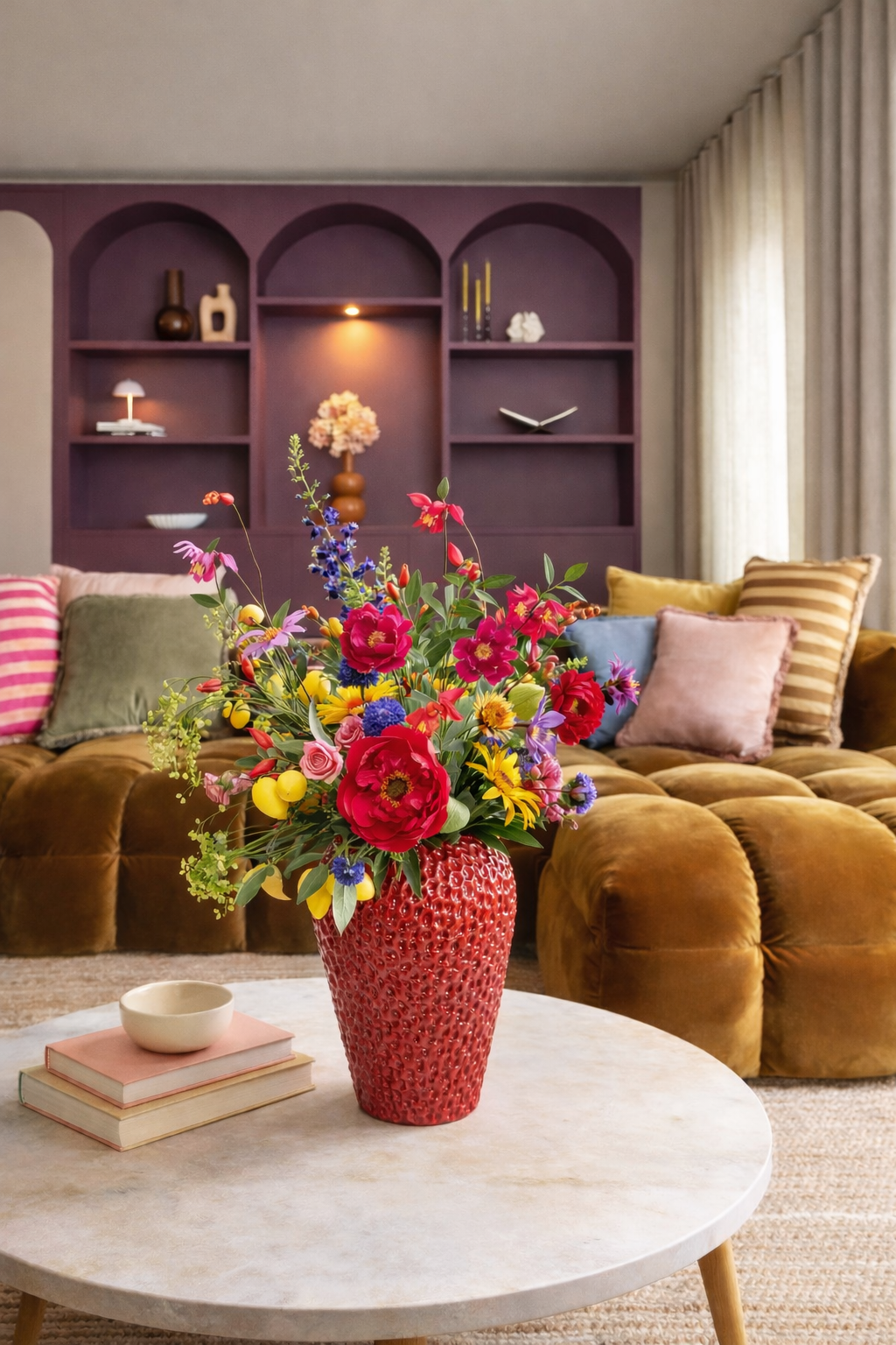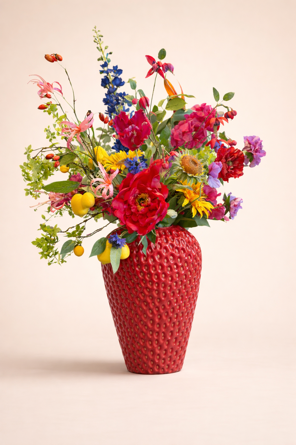 Je kan het boeket los bestellen voor jou eigen vaas, de aardbei vaas of kiezen voor een andere vaas.