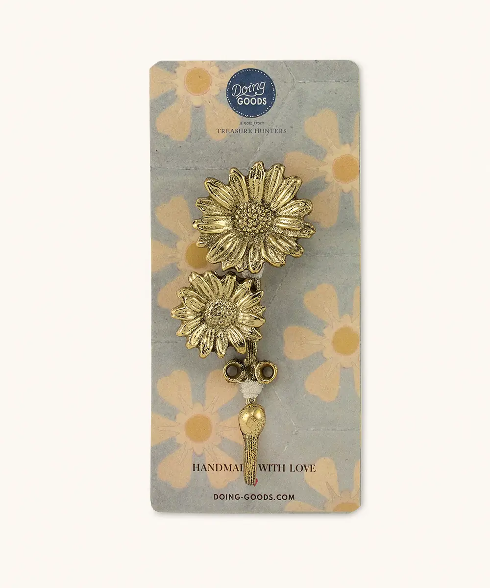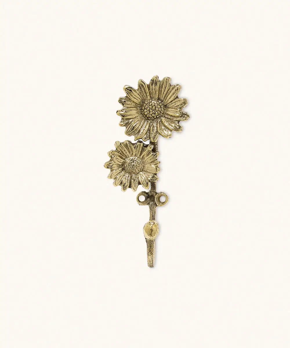 Haal de lente in huis met de Breezy Madelief Dubbele Haak, een charmant wandaccessoire gepresenteerd op een stijlvolle cadeaukaart. Met twee prachtig vormgegeven madeliefjes in een glanzende gouden afwerking, is deze haak van middelgroot formaat (12 x 6 x 3,5 cm) zowel functioneel als decoratief. Perfect om een bloementouch aan je kamer toe te voegen terwijl je je essentials georganiseerd houdt – ideaal voor natuurliefhebbers.