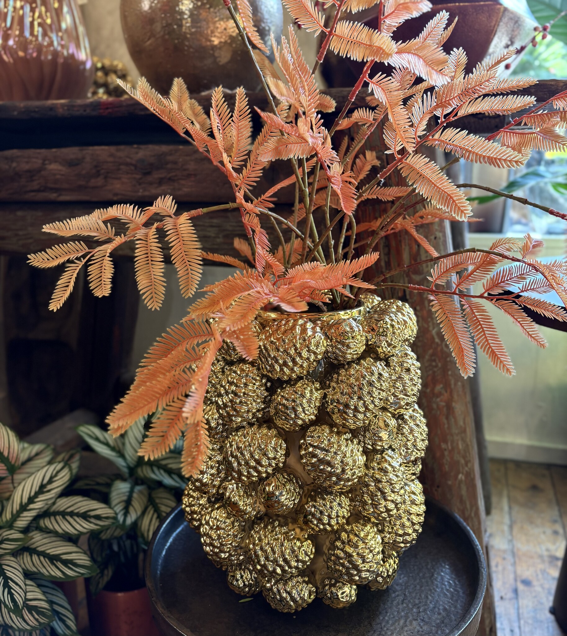 De Gouden Dennenappel Vaas is een elegante toevoeging aan je interieur. Met zijn unieke ontwerp, geïnspireerd op de natuurlijke schoonheid van dennenappels, straalt deze vaas stijl en verfijning uit. Het glanzende gouden afwerking voegt een vleugje luxe toe aan elke ruimte, terwijl de subtiele details zorgen voor een tijdloze charme. Perfect voor het presenteren van bloemen of als op zichzelf staand decoratief stuk, brengt deze vaas een vleugje glamour in je huis.
