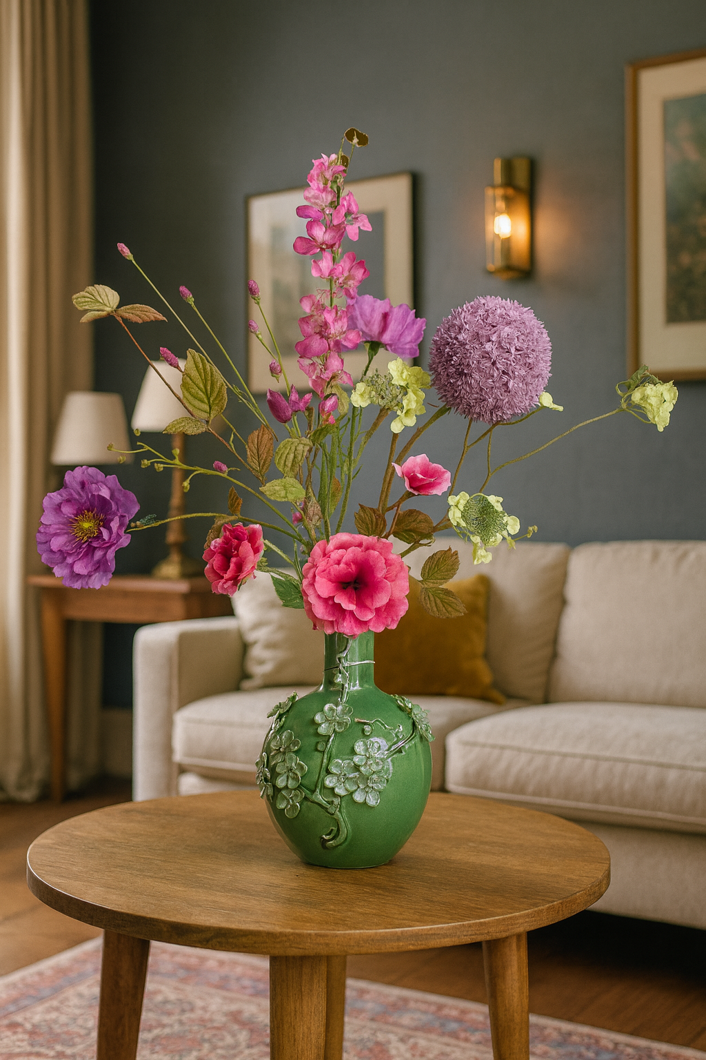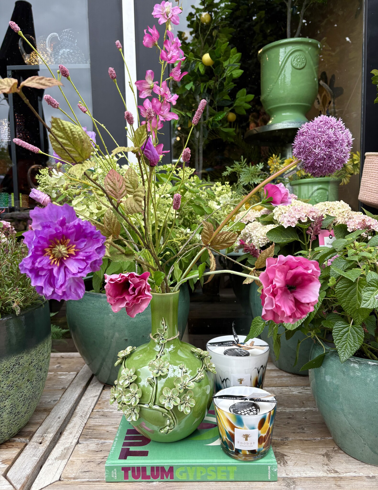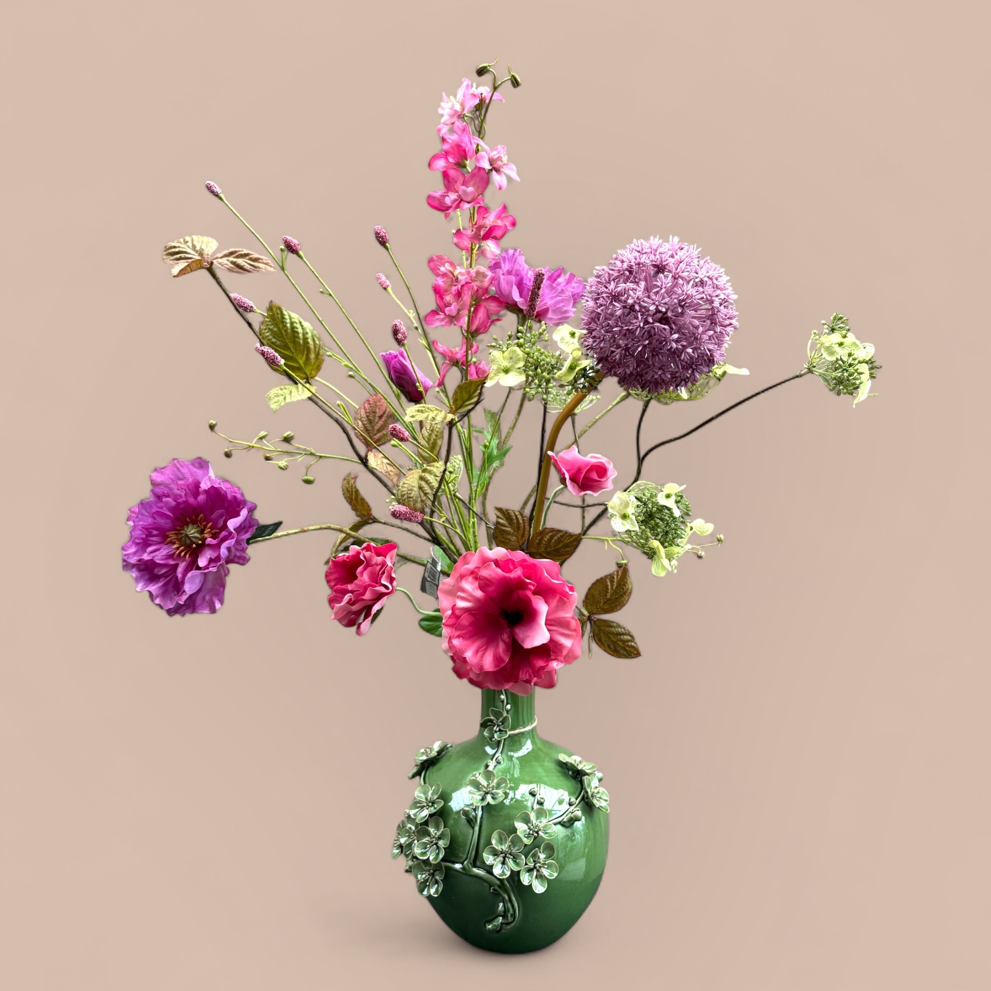 Breng luxe en sfeer in huis met dit handgemaakte zijden boeket van Silk-ka, geschikt in deze prachtige groene porseleinen vaas. Deze set is ideaal als eyecatcher in je woonkamer, entree of op kantoor!